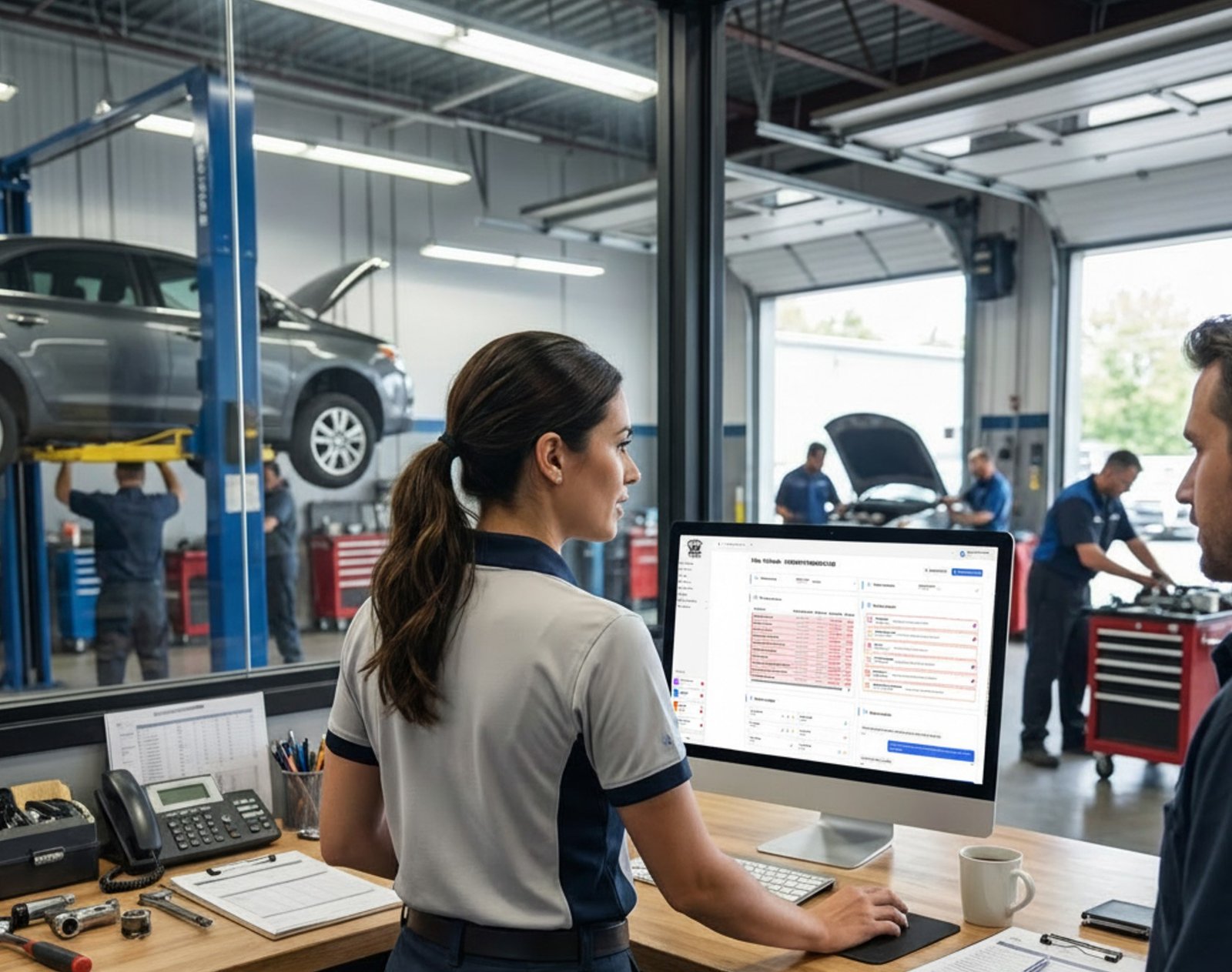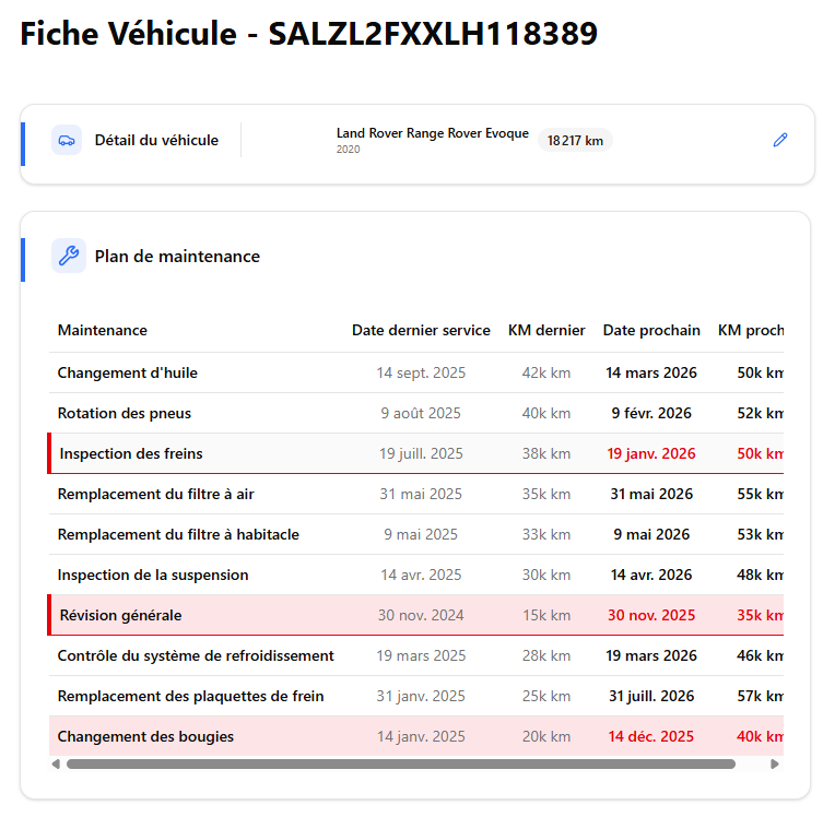 La fiche véhicule centralise l’historique des entretiens préventifs, incluant les dates et le kilométrage des services effectués. Elle calcule automatiquement les prochaines maintenances en fonction du kilométrage moyen mensuel.
