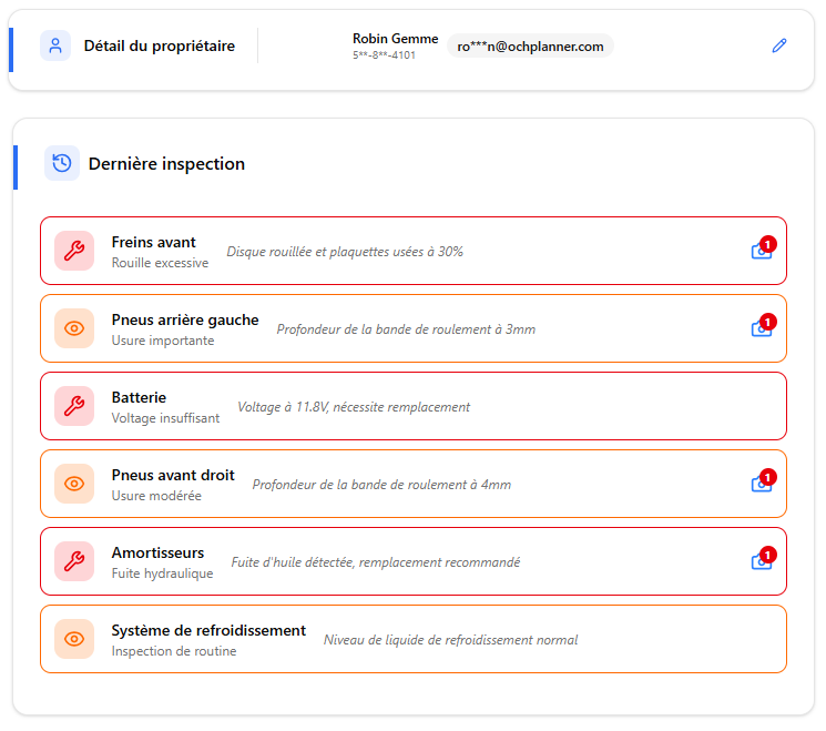 La dernière inspection du véhicule est affichée en détail, mettant en évidence les points à surveiller ou à réparer, accompagnés de photos pour une compréhension claire et transparente de l’état du véhicule.