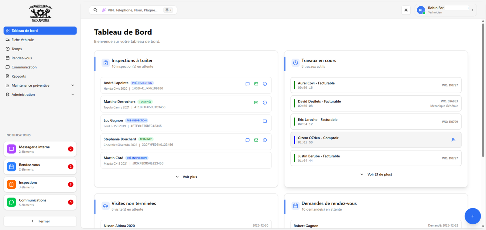Un tableau de bord centralisé offrant, en un coup d’œil, le suivi des travaux, inspections en cours et terminées, demandes de rendez-vous et échanges SMS avec les clients et techniciens.
